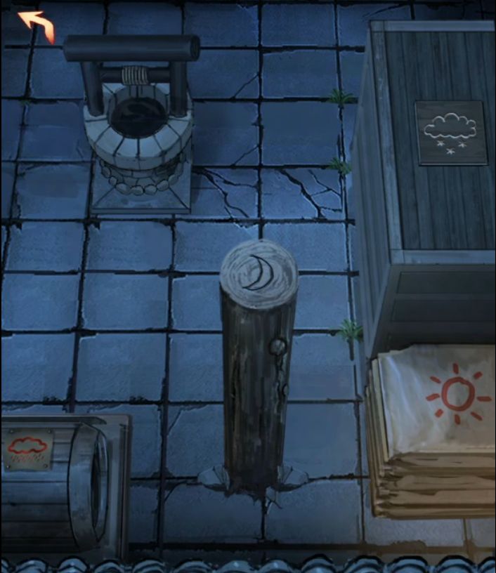 上楼后直奔窗口,往下看可以看到下面很多东西上有奇怪的图案,酒桶上是下雨,木桩上是月亮,木箱上是下雪,麻袋上是太阳,那线索肯定还是需要下楼去看的,下楼后观察一下发现这些东西的区别在于数量,数一下木桶有3个所以下雨=3,木桩只有一个所以月亮=1,米袋有6个所以太阳=6,木箱有4个所以下雪=4。