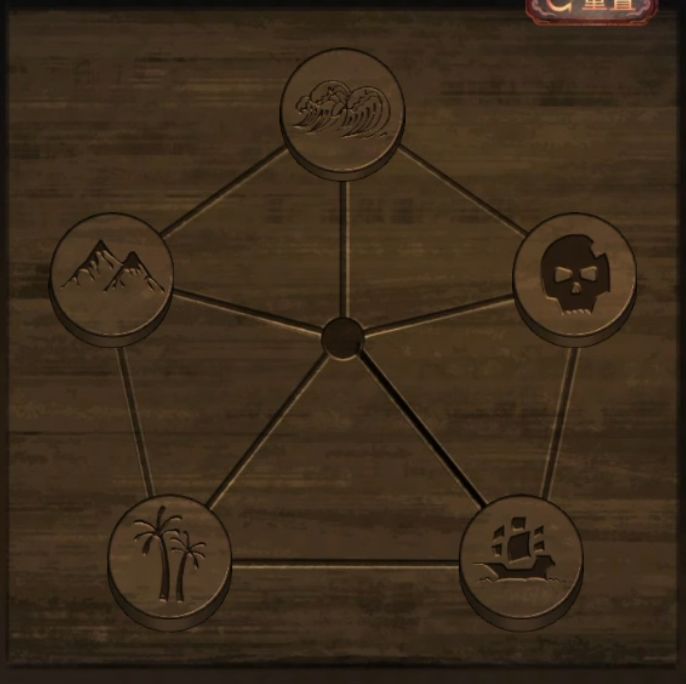回到楼上调查左边箱子上的锁,那么密码就是3641了,调整完毕打开箱子获得红墨水,唯一能用到的就是上面涂了一半红墨水的地图了,所以把红墨水涂满地图获得新的线索,五角星的上面是海浪,左上山,右上骷髅,左下椰子树,右下船。