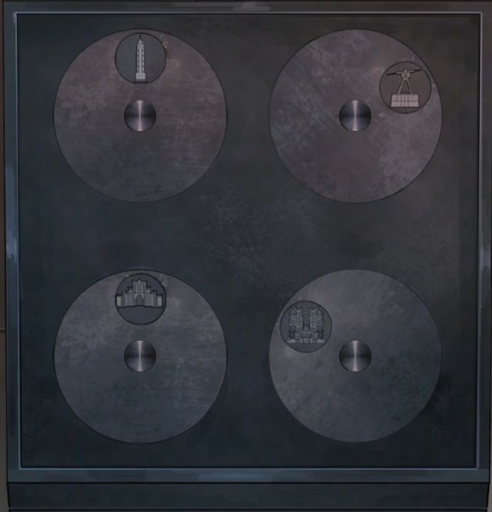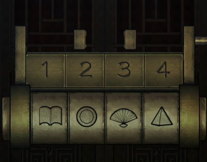 最后一个房间只有一个门,门上的锁图案是圆-四面体-书本-扇子,我们前面好像在每个房间的门口都见过类似的图案,所以回到第一个房间开始观察,第一个房间是书、第二个房间是圆形,第三个房间扇子,第四个房间四面体,所以这几个图案对应的数字就是1234了,也就是书=1,圆=2,扇子=3,四面体=4,调整打开最后一扇门。