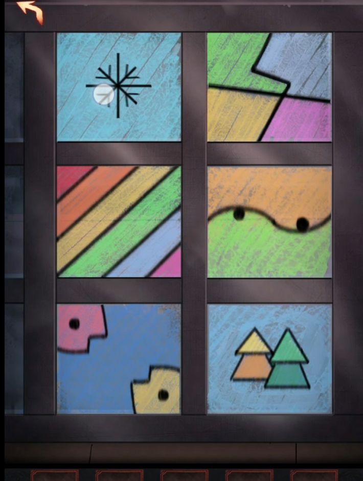 这里要观察的线索就是灯右上角红色杆子的位置了,按照位置可以得知门上六个锁的转动顺序分别为右上-右中-左上-左中-右下-左下,按顺序点击后打开门进入新的房间。