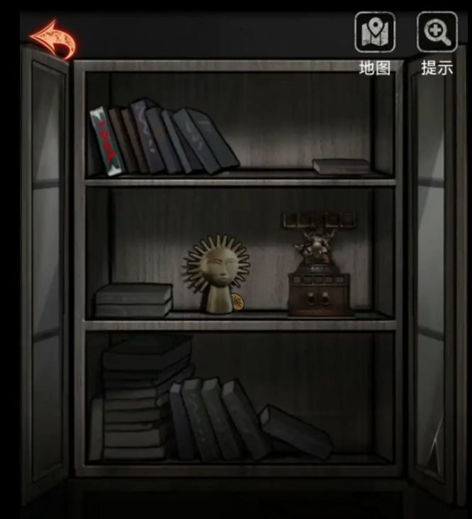 柜子门锁是超级简单的记顺序,米雪的顺序是12435,不知道是不是一样的,按顺序点击就能打开柜子,柜子里面可以拿的挺多的,第一行书上线索要在镜子前点蜡烛,在碗里装血用小棍敲碗三次来召唤亡灵,第二行中间雕塑旁边有金色太阳按钮,右边奇怪的雕塑明显是要找五个颜色按钮装上然后按照按钮符号调整下面的,可以随手把红按钮装上。