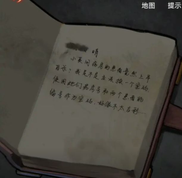 打开日记后获得线索密码是小奚病房号和她们两个患者编号的,病房号我们已经知道了是2011,其中一个患者是44号,我们还差另一个患者的号,这里不要穷举哦会显示线索不足的,继续调查吧,记得翻到最后拿走肖医生的ID卡哦。