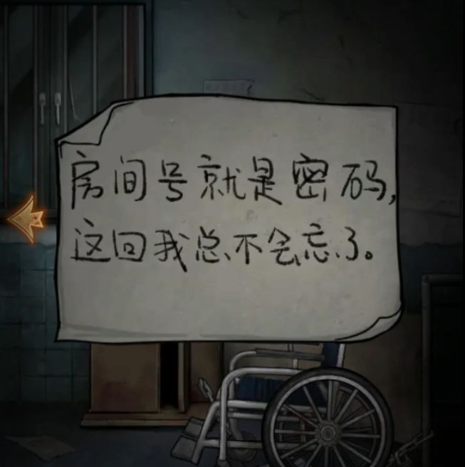 在这里需要用钥匙的也只有旁边轮椅了,用钥匙打开轮椅的锁链,推走轮椅就露出病号服,上面钥匙挂着2011是病房钥匙,拿走钥匙后记得看一眼病号服上面的编号是44,后续有用,然后用钥匙打开病房大门就能开始第一章了。