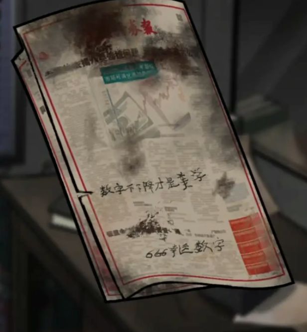 然后调查一下镜子前面的报纸,获得新的线索幸运数字是666,而且数字不能下降,也就是需要从小到大排列,再结合墙上写的2568,从小到大排列就是2568,再把幸运数字加进去变为6位数密码的话就是256668。