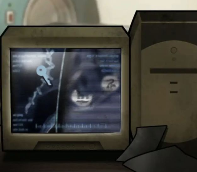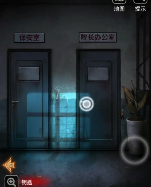 雕像拉上来之后检查室就自动开启了,不要下楼,点左下角的箭头就能转向看到检查室了,如果没有拉雕像的话是显示使用中进不去的哦,现在可以进入了,进来后直奔玻璃后面,点击CT左边的红色开关拉出扫描架,把肚子很胀的木偶靠着棉被放上去,再按开关复原扫描架,来到电脑旁边就能看到棉被里面有一把钥匙,而木偶肚子里的两个按钮一个是上面三条竖线下面一条横线 ,另一个是个长头发的不字,记下来。