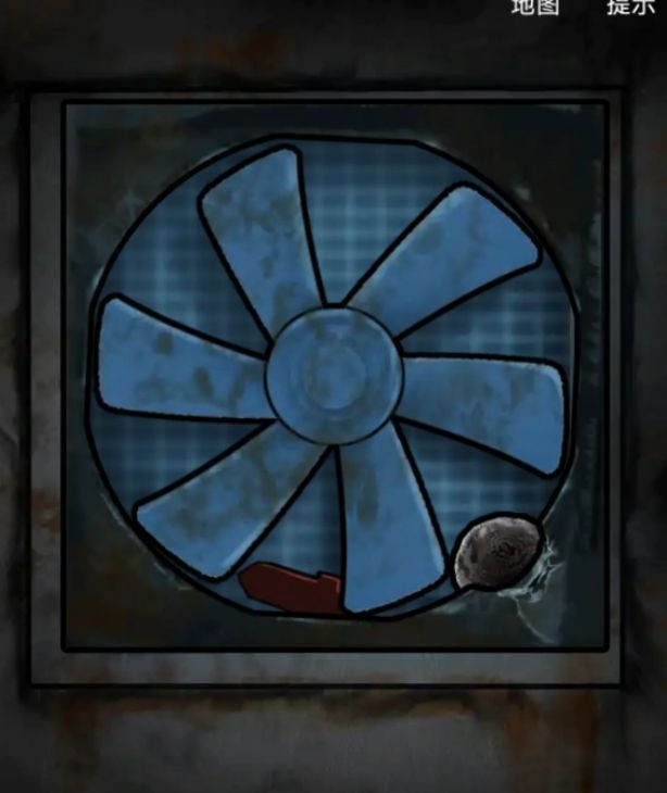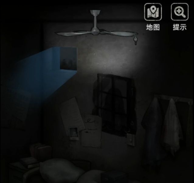 然后回来再转动一次镜片,这次照到了墙上的海报,但那不是重点,重点是海报右下角有电风扇的开关,点一下让风扇转动,能听到很清脆的物品落地声音,想必是那把钥匙已经被晃下来了。