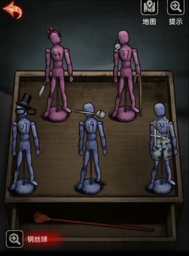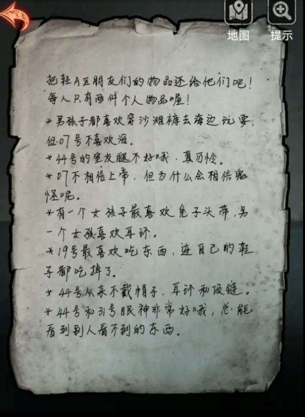 首先还是先来解密小人吧,墙上的纸条是线索,每个人有2件物品,沙滩裤限定男,7号不喜欢沙滩裤,44号的室友是57号腿不好要拐杖,7号不信上帝,2个女孩一个有兔子头带另一个有耳环,19号喜欢吃东西有勺子,吃掉了一只鞋,44号不带耳环所以带兔子头带,也不带项链,44号和31号不带眼镜。