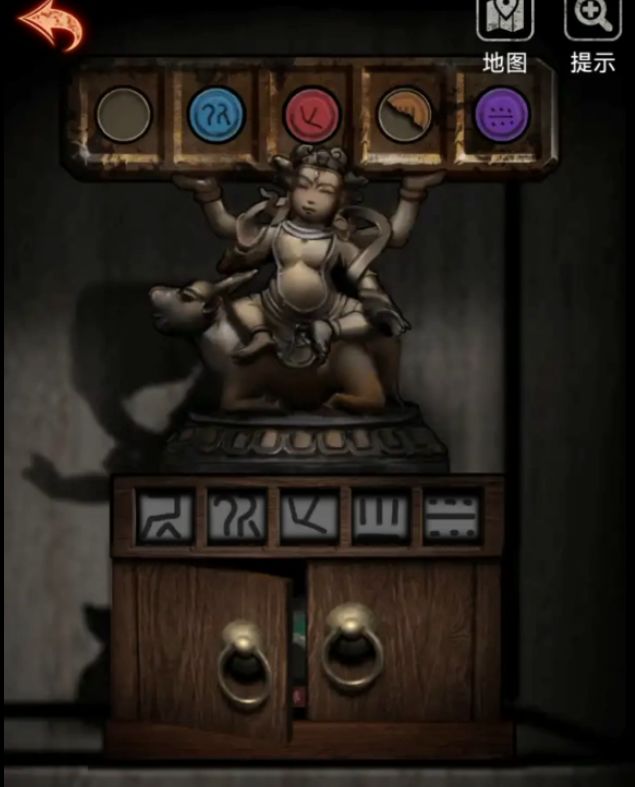 一路回到2009病房,在柜子中找到那个颜色的机关,这里如果忘记了我们再复习一下,墙上挂着的画颜色依次为绿、蓝、红、橙、紫,将我们前面获得的红色和紫色按钮放上去后还有两个不知道的,但是结合我们给木偶做CT看到的第一个应该是长发不字,橙色的只有一半,可以看到上面是三条竖线,那就是三条竖线+一条横线的,将下面的图案调整为对应的后下面小柜子就打开了,获得了一块石头。