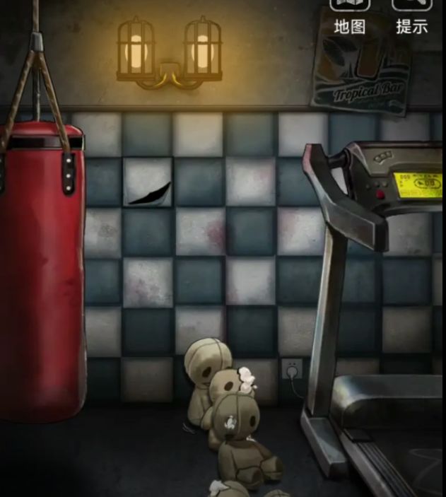 给跑步机插上电源,插座旁边滚过来一个玻璃眼球拿走,点击跑步机左边红色按键启动跑步机拿到蓝色小人头,旁边最后面的小人偶被和拳击手套缝在一起了,用指甲剪剪断缝合线拿到拳击手套,用拳击手套打旁边的沙袋掉下来橙色小人头。