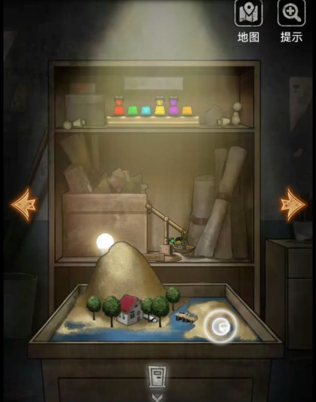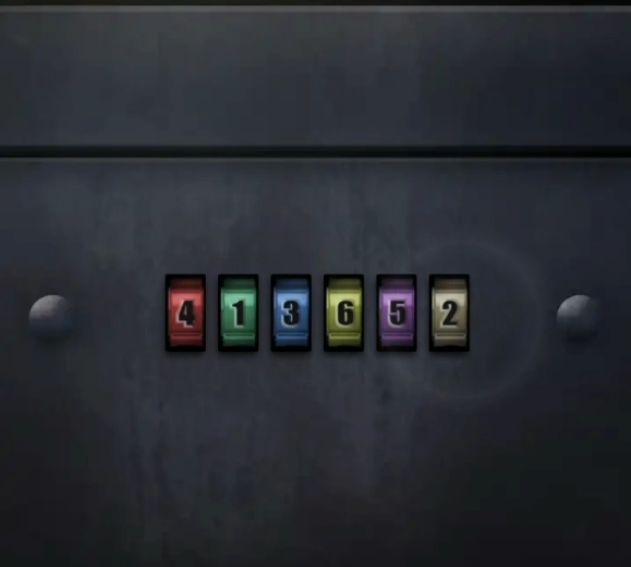 桌子上有个七减一彩数字的密码盒,和我们刚刚帮忙装上头的小人颜色相同,小人从高到低的顺序为黄紫红蓝橙绿,所以密码盒红绿蓝黄紫橙对应的数字就是364125,如果是从低到高的顺序密码为413652,打开获得灯罩。
