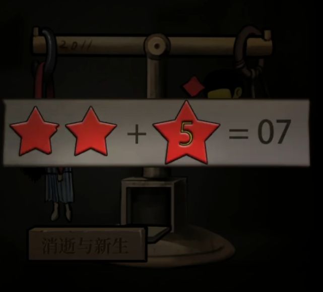 因为2011房间是两个病人的,那么就用44号病人的兔耳发带把57号病人吊上去象征着消逝,右边小男病人手里拿个小旗子象征着新生吧,完成后天平平了,暗格打开获得一张密码纸,提示一个星星+一个星星+一个写了5的星星=7,也就是说没写序号的星星相当于1,写了序号的星星写多少就是多少。