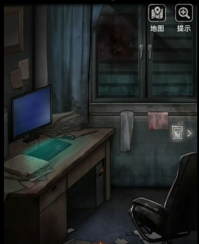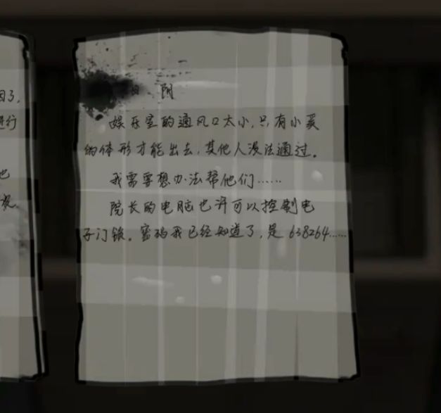 首先找个镜子或者直接把图片镜像一下,看到密码是5823,这里可以试一下电脑密码的话位数不对,桌子左下角倒是有个抽屉是四位密码,但是还需要其他提示,调查桌子上放的一叠纸提示31号患者倒吊偷窥院长室,这时候我们才能给抽屉密码调整为5823,打开获得电脑密码638264,然后来不及输密码就高能了。