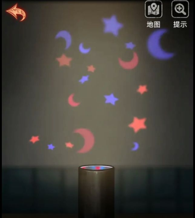 把灯泡装在桌子最上面的小夜灯上,然后装上灯罩,在墙上投影出了红蓝色的星星月亮,数一下红色月亮有3个,红色星星有6个,蓝色月亮有4个,蓝色星星有5个。