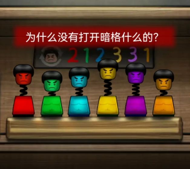 回到中间场景先用拳击手套拿到灯泡,然后把蓝色绿色橙色小人头都装好,上面提示小人头画了个旋转的标记,所以按照对应颜色把小人头给旋转对应圈数,转好后小人会自动转头过来不知道算不算高能,按照小人头的高度依次是黄紫红蓝橙绿,先记下来。