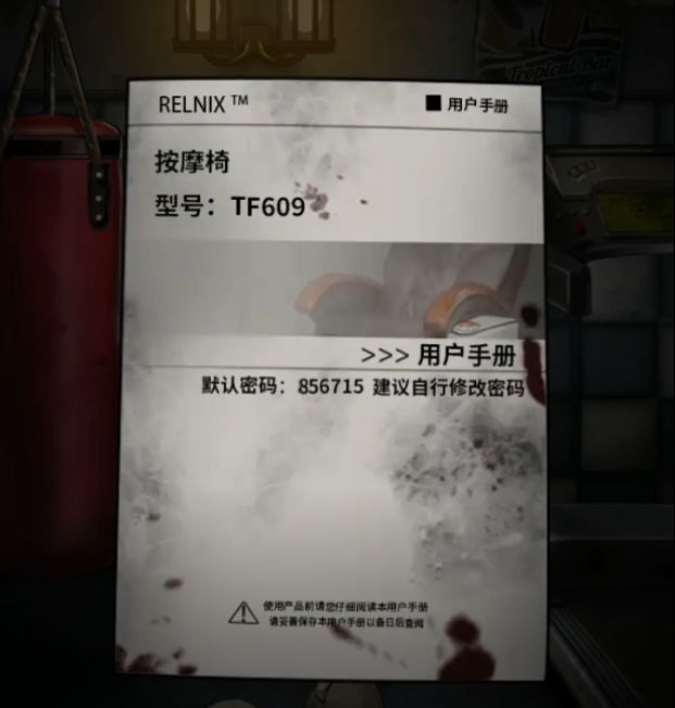 左右都能调查就习惯性先左边吧,地上的娃娃挪开发现按摩椅的说明书,默认密码是856715,前面有说过不要太懒用原始密码或者简单的把密码倒过来,一会我们就可以试一下了。