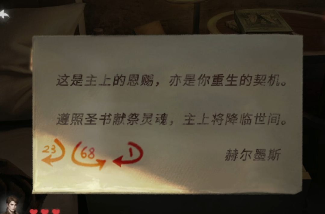 调整完毕打开抽屉获得剪刀和新的小纸条,纸条上是三个有箭头的数字,记下来顺时针23、逆时针68,顺时针1,一般这种就是什么机器旋钮或者保险柜的密码了。