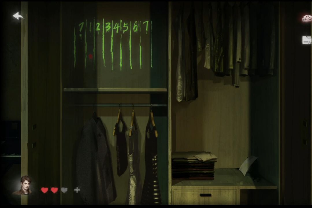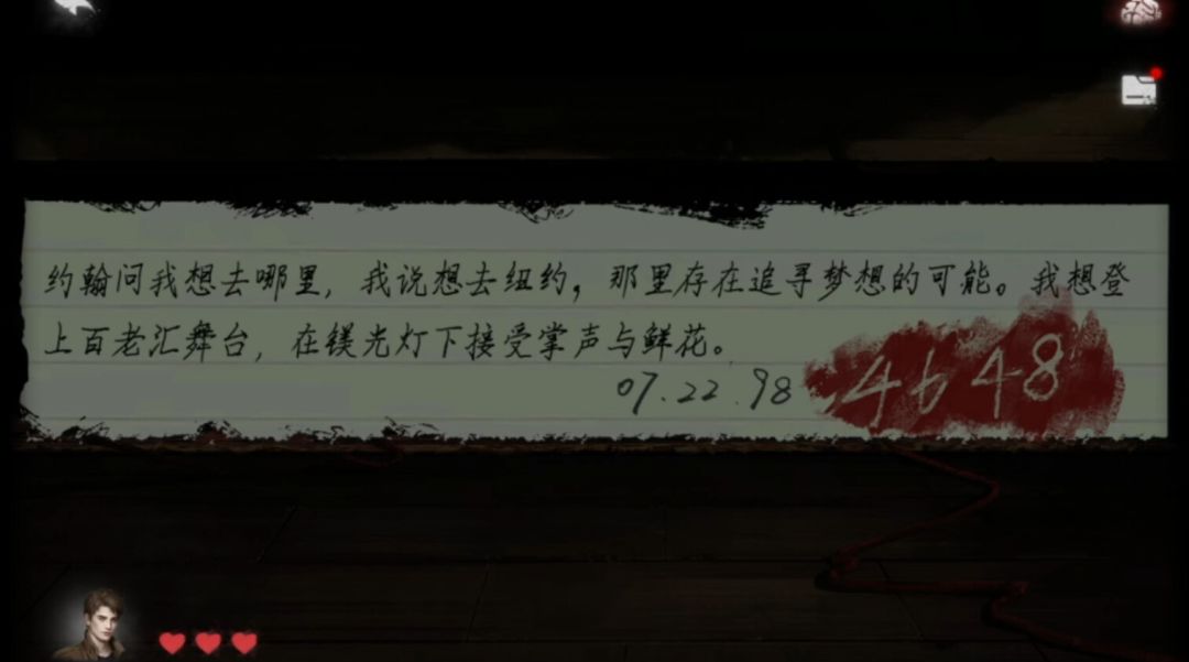 从床下出来后发现后面的衣橱被刚刚怪打开了,先记下来左边绿色数字,那个红点就是钢琴上的红点了,也就是说红点代表的是1,但是暂时不知道要怎么弹所以先记下来,右边有一封信可以看一下剧情,信后面是娃娃的头拿走。