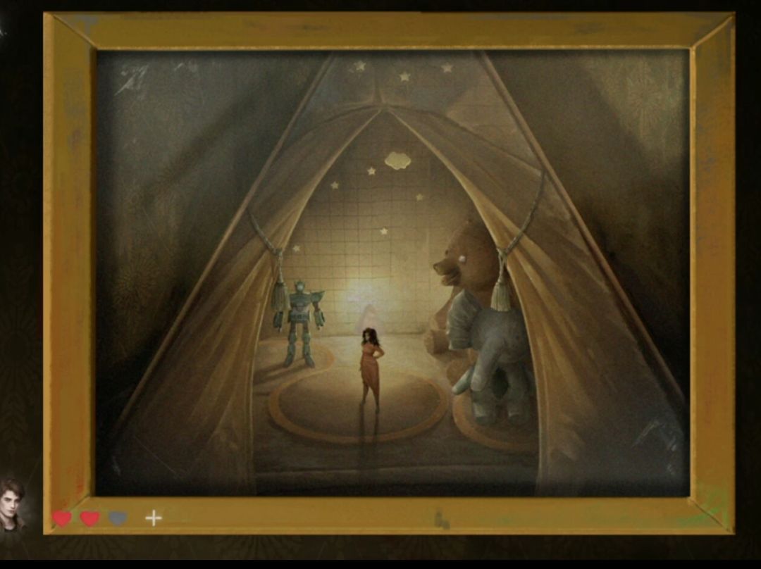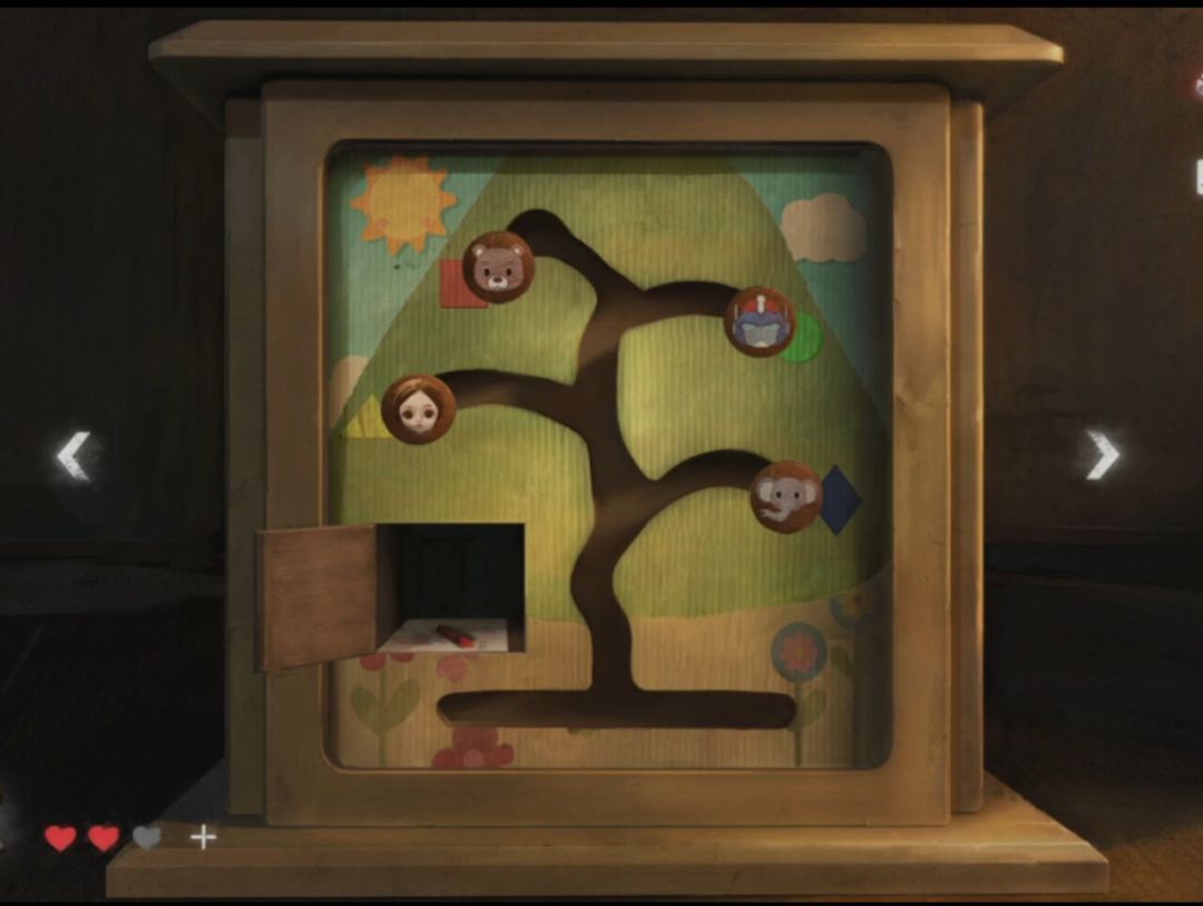 调查左边的玩具盒,向左转一下来到很卡通的界面,把前面帐篷对应的谜底机器人绿圆、娃娃黄三角、大象蓝菱形、熊红方形调整好,左边暗格打开拿到一只蜡笔和一张画。