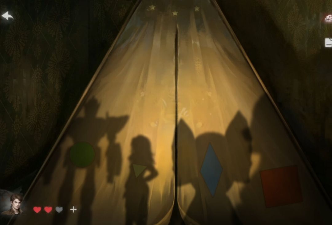 顺便调查一下左边的梳妆台,刚刚打不开的抽屉在怪物的大力震动下也被打开了,从里面拿到睫毛胶,回到左边房间,先给帐篷里倒吊的娃娃点上睫毛胶,然后装上头就拿到了娃娃,把娃娃放在中间位置拉上帐篷后显示出了影子对应的图案,记下来机器人绿圆、娃娃黄三角、大象蓝菱形、熊红方形。