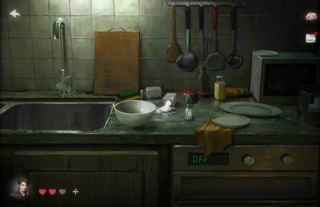 调查左边的灶台,把空玻璃瓶,倒下的一瓶盐,空碗拿到手,然后用碗点击水龙头就能获得一碗水,再从右边女鬼出来过得电视机旁边拿走烛台就准备完毕了。