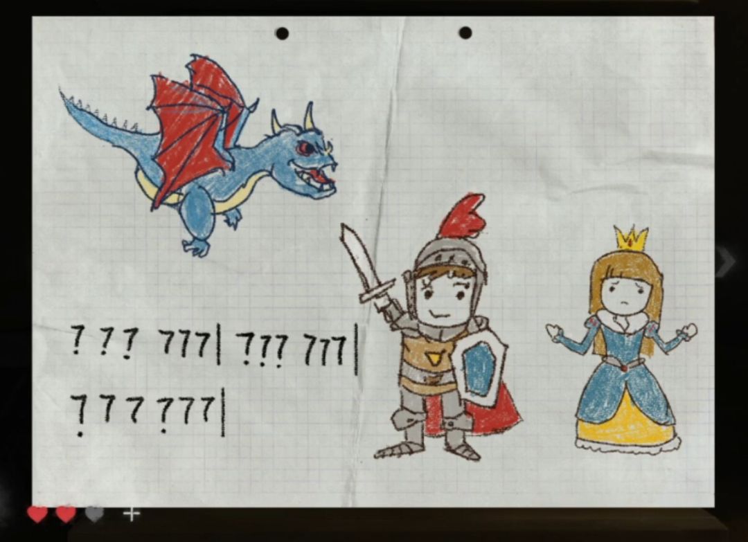 画就是山姆很珍视的骑士从恶龙手中保护公主的画了,左边还有个明显是钢琴谜底的提示,对应我们刚刚钢琴红点是1来看,就是红点左边的键3次,红点右边第7个键3次,重复一遍后左右右左右右,弹奏完成后上面暗格打开获得羽毛笔,也可以继续剧情了。