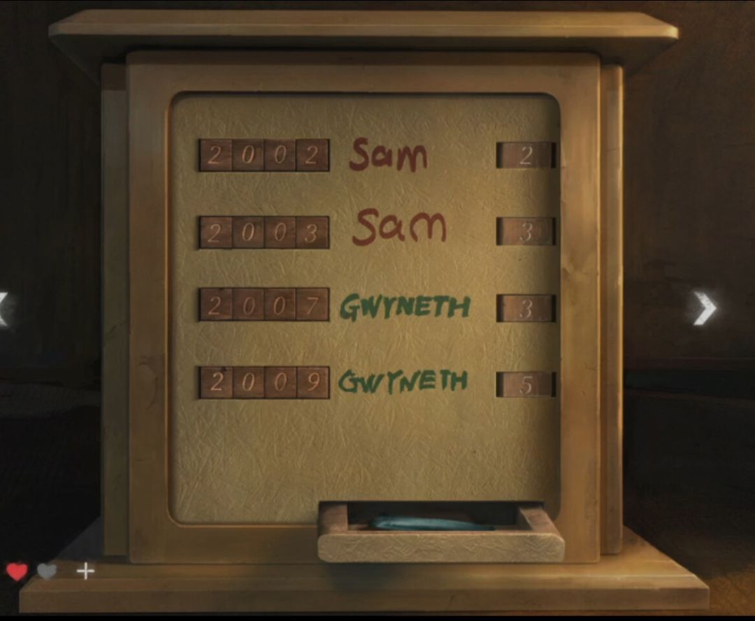 左边床上有被缝住肚子的大象,用剪刀剪开大象肚子就能获得大象玩偶了,还从里面跳出来一只黑猫,右下角地上有个方形玩具盒,往左或者右转两下就看到了算术题,前面我们已知山姆生日是00年9月14日,格温妮丝的生日是04年8月14日,所以02年山姆2岁,03年山姆3岁,07年格温妮丝3岁,09年格温妮丝5岁,调整完毕暗格打开获得猫条。