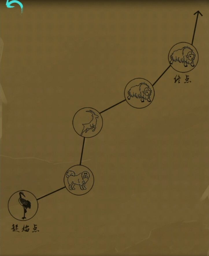 第二章开始剧情不长就直接解谜了,首先是调查右边的路标,去掉遮挡路标的彩条后看到图案,看图找位置小游戏,路标线索是丹顶鹤-藏獒-藏羚羊-牦牛-牦牛,然后调查一下左边的图案发现藏獒和丹顶鹤挨着的就只有中间下面那个,所以从下面丹顶鹤开始连线就获得了路线,因为是三岔路所以我们只用看看左右中就行,记一下路线是右中右右,点击路开始走就行了。