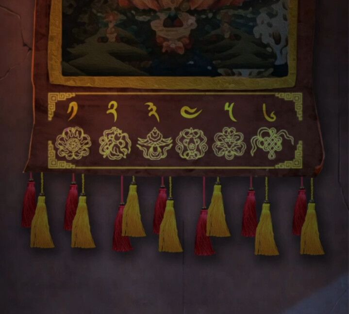 然后回到上个房间看一下被浇水的挂画,上面也有个带彩珠的彩幡,同样是记一下珠子颜色和节数,黄4节,深蓝5节,红1节,浅蓝3节,记下来后再回到壁画密室,调查左边门上的机关。