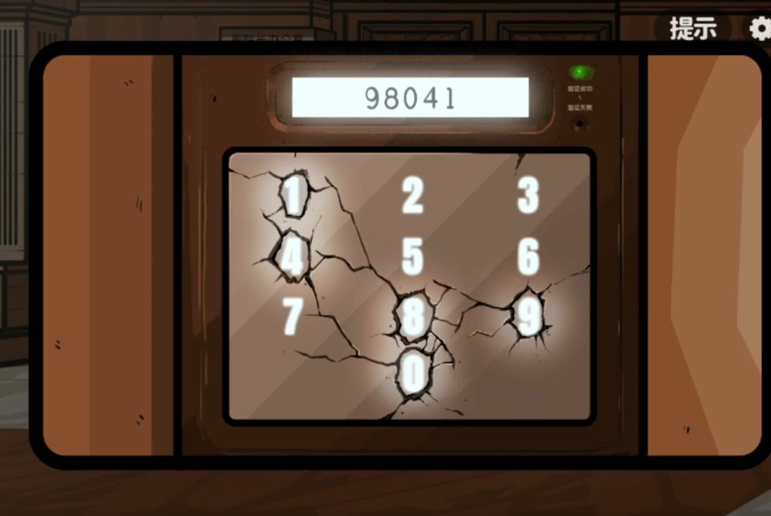 剧情过后只有左边副院长办公室门锁可以调查,点看查看五位密码五个圈圈,是个先后问题,没有被别的裂缝穿过的就是先出现的裂缝,所以按照裂缝先后顺序得出密码为98041,开门进入。