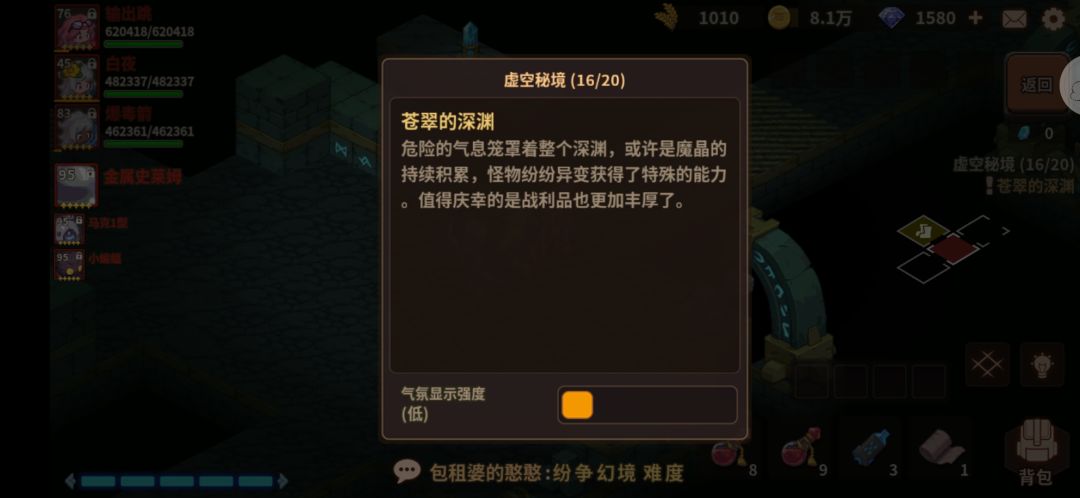 背包共4*15=60格,开启所需钻石递增,最高500/格。萌新根据下本时的掉落情况自己酌情开启背包格。