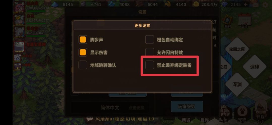A9:扔不掉的叫“绑定装备”,是哪怕你死后有损返回也可以带出去的装备。莫古力处购买的装备和挑战机关胜利宝箱开出的装备都是绑定的。如果想扔掉,点右上角“设置”里的“更多设置”,将“禁止丢弃绑定装备”一栏关闭即可。
