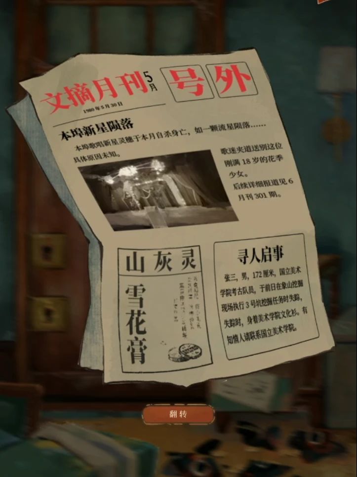 右转右边中间罐子提示里面有东西,所以用很重的烟灰缸打碎罐子拿到一个白色脸谱钥匙,下面抽屉中有张报纸看一下,注意1980年5月30日是刚满18岁,所以出生于1962年,当然可能有小伙伴表示1980看不清线索不明这什么破游戏啊,所以翻转一下报纸有大字1979年是17岁,所以这也能推出1962年出生,结合刚刚的日历基本可以确定生日是1962年5月28日了,虽然还不知道要用在哪里。
