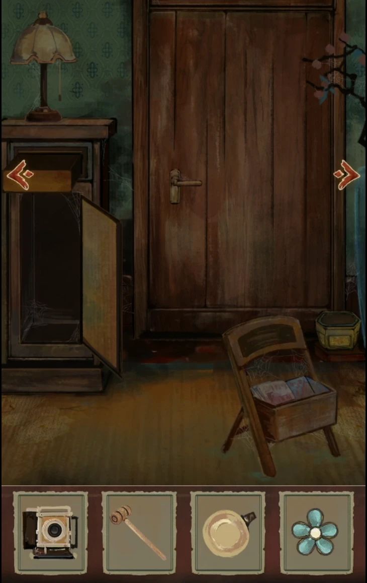 拿走左边桌子上的照相机,左下角柜子可以打开获得一个木槌,左边中间抽屉打开获得五瓣花纽扣,这样三个纽扣就齐了先不着急回去,右下角灯泡拿走,此时物品栏如下继续右转。