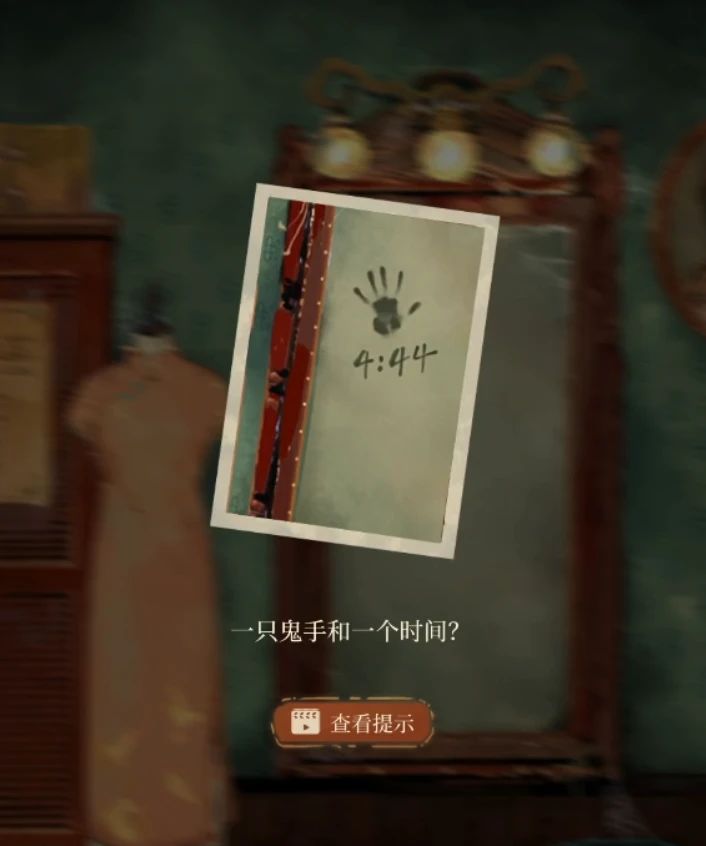 往右转把三个灯泡都安装在镜子上,这时候左边旗袍被照亮显示出四只鸟的图案,记下来后先用麂皮清理镜子上符咒,然后使用相机选择四处拍拍就能继续剧情了,剧情后拿起地上照片,调查后发现有个时间4点44,记下来。