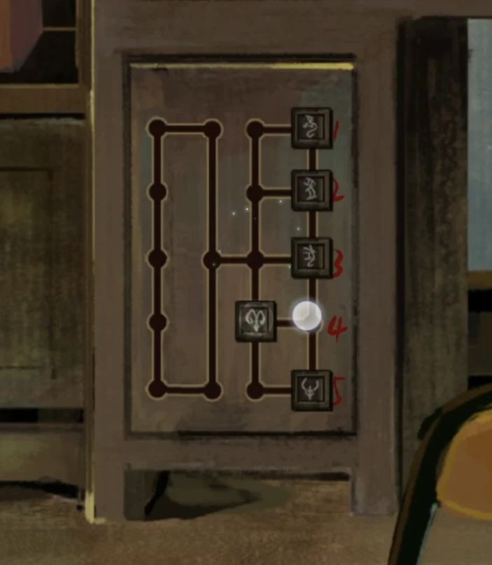 左转来到书桌,用胶带修好台灯的电线,调查桌面点击台灯下面的圆按钮开灯,将取到的三块地球仪碎片依次放在灯光下就能显示图案了,这里很贴心的会自动记录哦,所以记下来小老鼠1,羊头4,牛头5,这样我们就有了五个鬼画符对应的数字了。