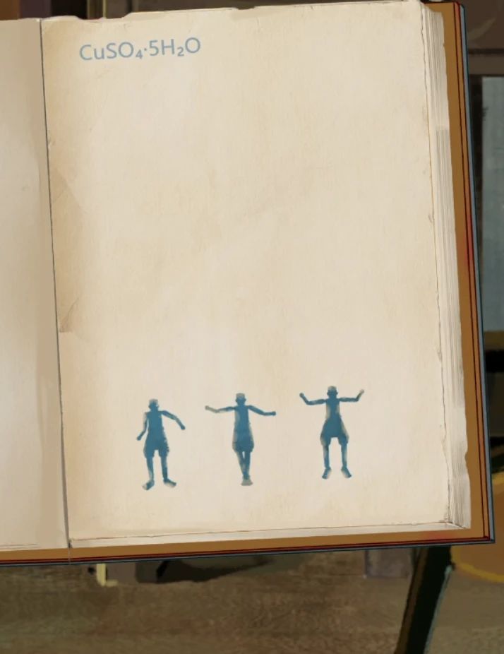 日记本第一页左上角就写了个化学元素,就算是毕业很久的社畜也能看懂右边H2O,而我们刚好手里有水,所以用水泼它~获得了三个跳舞的小人,不过我们也不是福尔摩斯不需要探究它的秘密,只需要画下来一会去调整一下,其实也不用画下来,因为一会调整的时候下面会有显示。