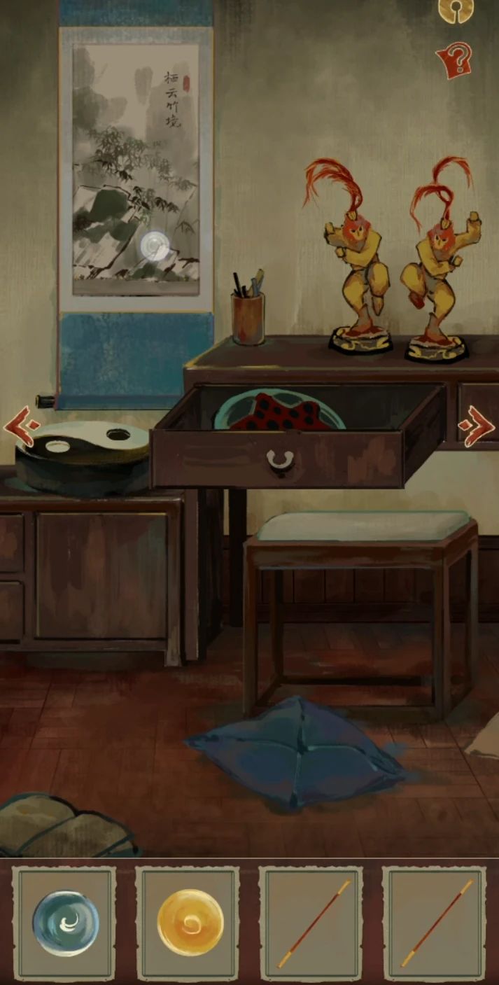 拿走右边中间黑色书,继续右转拿走右边中间黄色书、下面铜钱手链和上面两根金箍棒,中间抽屉打开获得两枚圆球跳棋,这里组合一下两根金箍棒就获得了长筷子。