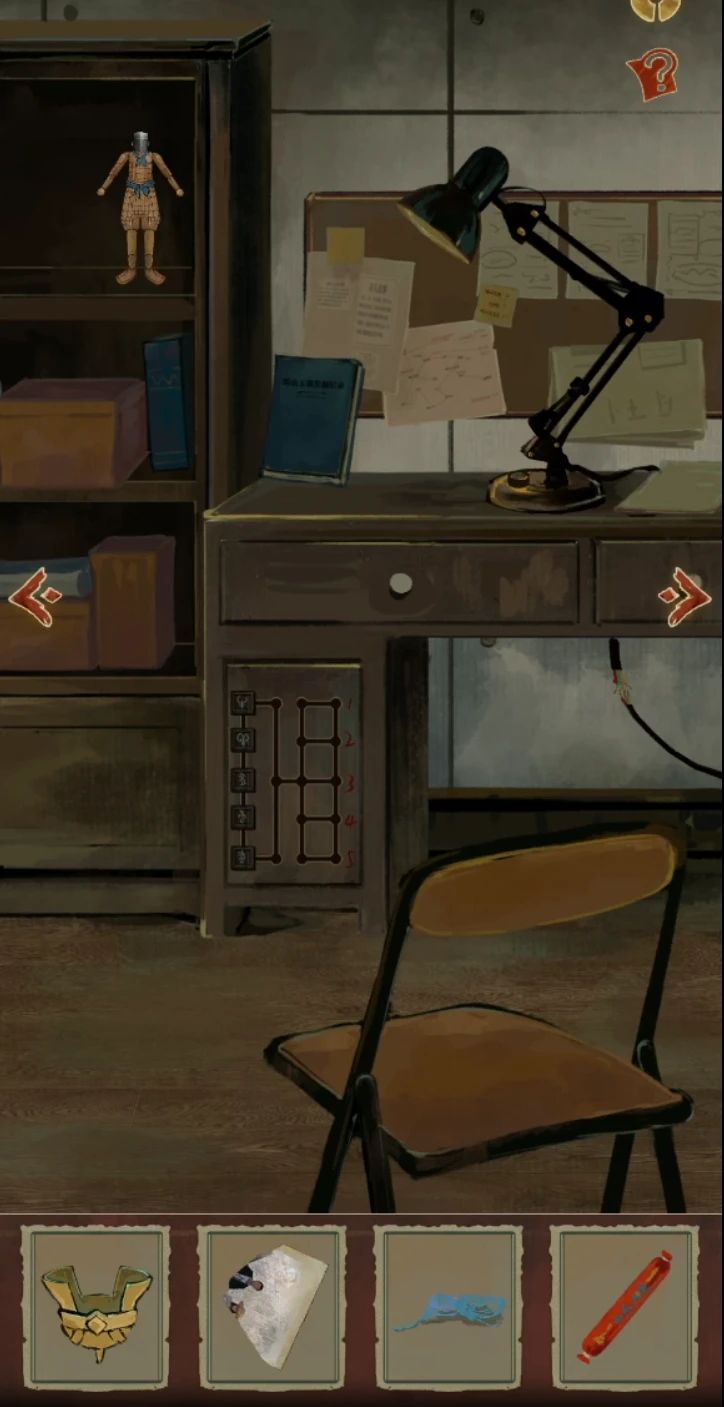进入密室后先调查左上角铠甲小人偶,帽子取下来提示关节可以动,小人下面一层有一角照片,桌子左上角有一团绳子,左边抽屉里有一根火腿肠,话说火腿肠这么多年了没有过期吗???台灯的电线断了需要胶带,这里调查完毕后物品如下哦。