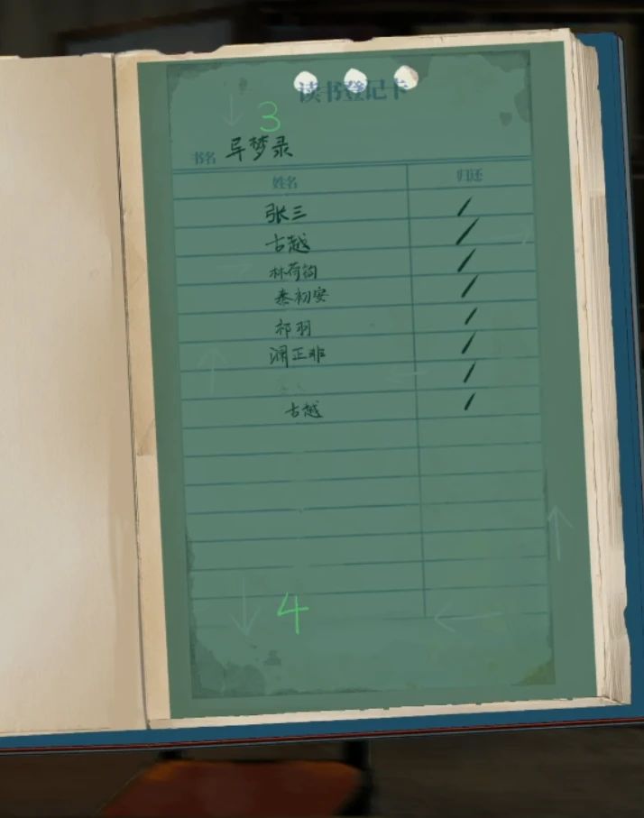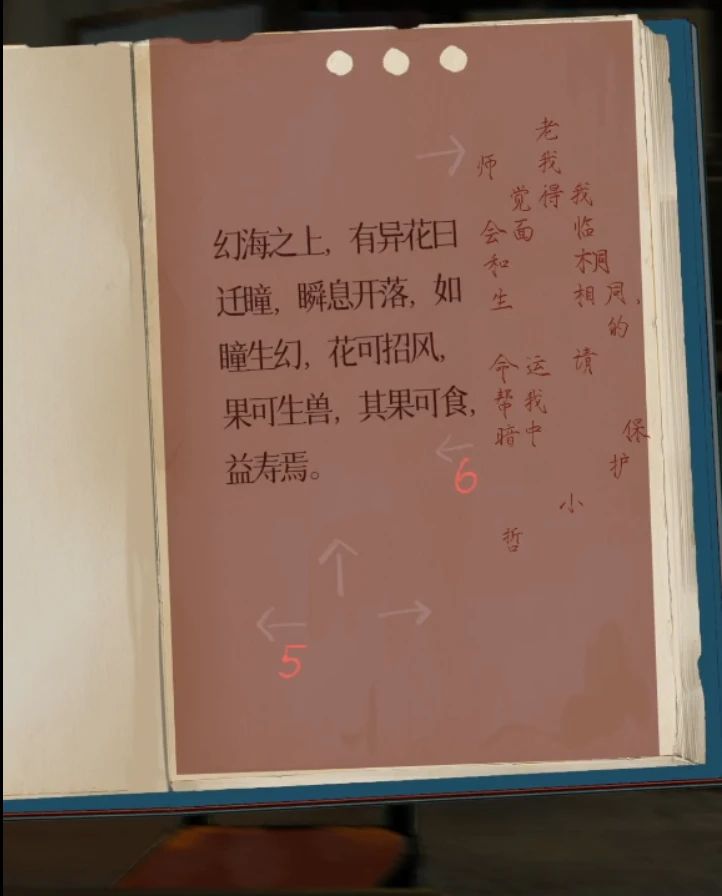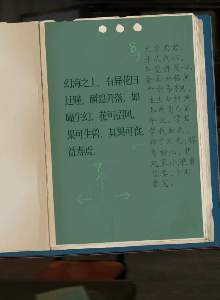 中间的夏邗(han)列侯(这里有个小错误应该是侯不是候)打开第一页拿到一张照片,第二页拿到一张红板板,右边的夏邗世家打开第二页拿到一张绿板板,都拿到后就可以打开最左边的异梦录了,首先放上红板板发现有两个箭头旁边有数字,记下来1↑2↑,然后拿下红板板放上绿板板看到3↓4↓,翻到第二页放上红板板看到5←6←,注意右侧文字也能看到内容了,放上绿板板看到7↑8→,继续翻页放上红板板看到9↓,放上绿板板看到10↑,所以顺序为1↑2↑3↓4↓5←6←7↑8→9↓10↑