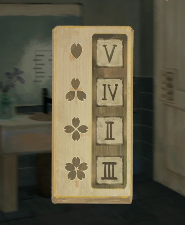 按照门锁上梅花的花瓣数,我们分别数一下1瓣、3瓣、4瓣、5瓣梅花的数量为5.4.2.3,这也就是门锁的密码了,调整一下开门进入新房间。