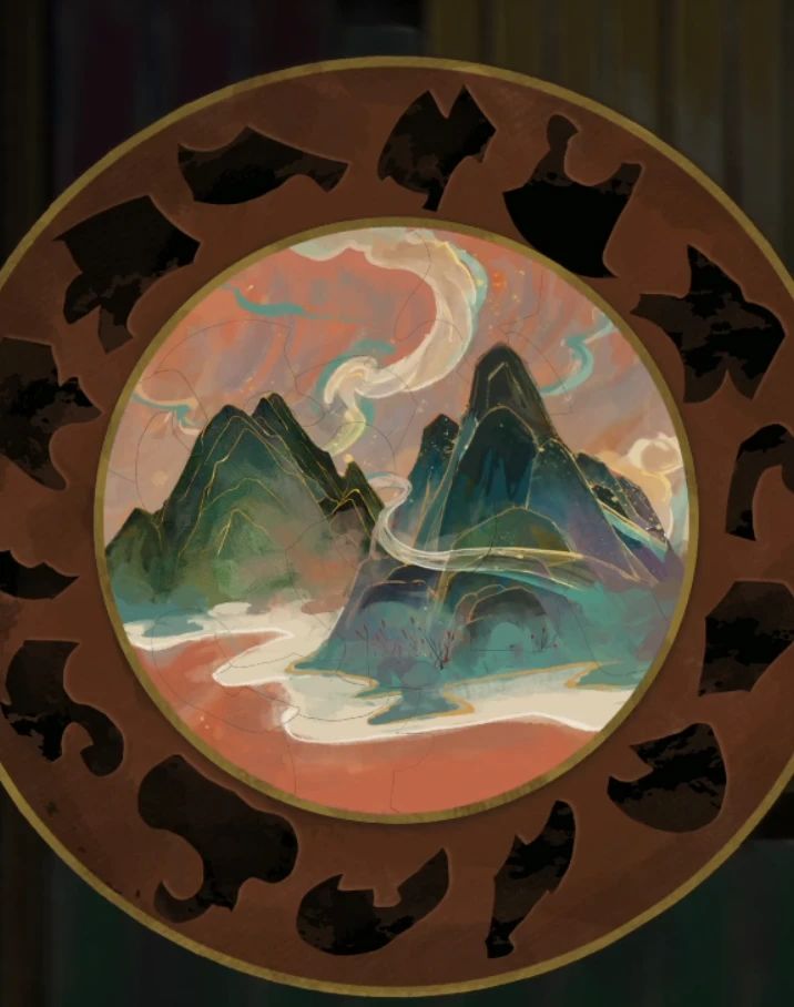 右转左下角拿到铁铲,门上是四位八卦密码,右边鸟笼直接打开获得又一块圆形石板,看来是要凑个十二生肖了。继续右转左上角乌鸦嘴里有笔看来是要用吃的来换了,乌鸦下面不联动的转圈拼图米雪也很喜欢,主要是简单啊!从内向外调整一下拼图打开获得一把钥匙,拼图如下。