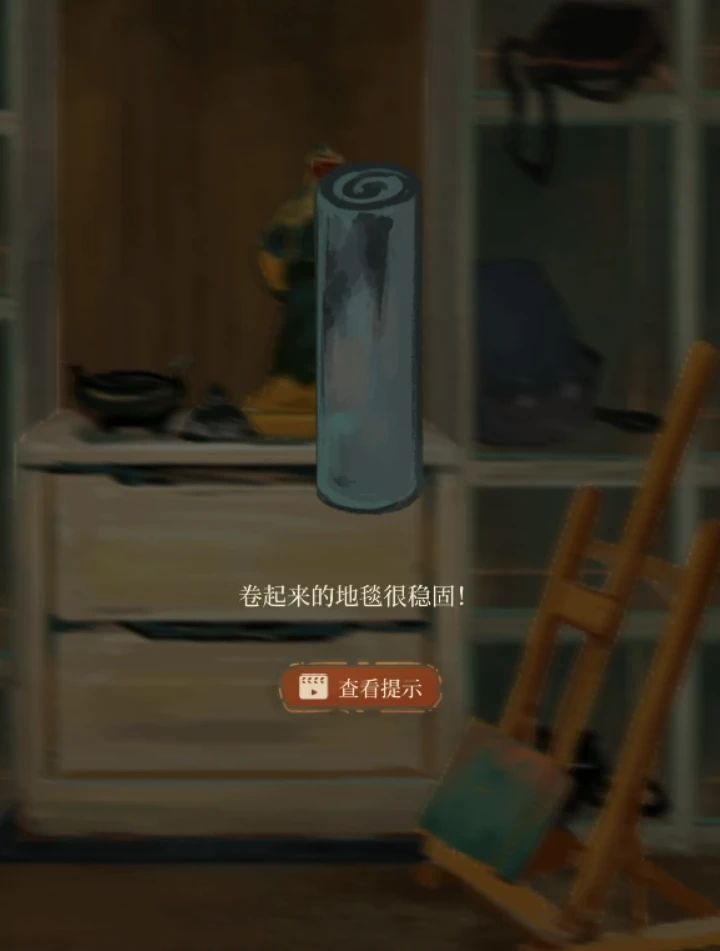 右转再右转找到木琴,按照这个顺序敲击后获得一把剪刀,左转来到第一个场景用剪刀剪下地毯,调查地毯后提示卷起来,卷起来后右转2次把地毯放入垃圾桶,这时候场景左上角就出现了新的箭头,点击后使用冰刀鞋打开螺丝就能拿到资料和钥匙了。