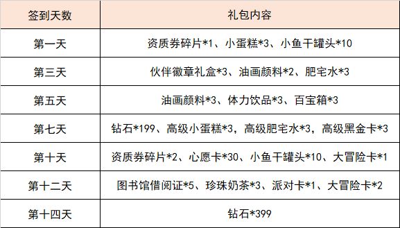假期福利送不停,签到领好礼!9月29日-10月20日期间前往签到页面,点击【立即签到】领取对应签到礼包,签到满14天送399钻石!