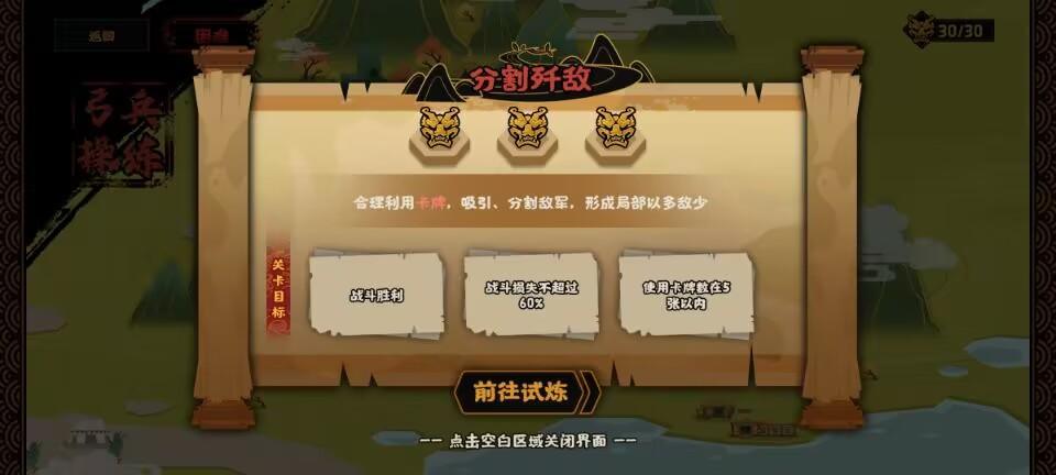 李广带队教你使用弓兵对敌,而最后一关的名字也很有意思,叫做分割歼敌。玩家们要做的就是用四队弓兵对敌五队步兵,要进行8000vs10000艰苦卓绝的战斗。