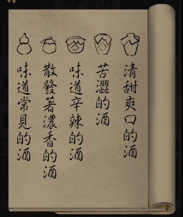 对照一下记录和招牌能看出来第一个葫芦形状的是竹叶青,第二个没贴纸的圆罐子是杜康,第三个有贴纸的矮罐子是女儿红,第四个有贴纸的高罐子是状元红,第五个没贴纸的高罐子是琼花露,回到二楼进屋调整一下让酒和后面的名字对应上就能移动酒柜露出后面挂画,也就是左上贴纸高罐,右上贴纸矮罐,中间白罐,左下蓝花罐子,右下红葫芦,打开后点一下挂画后面就是暗格,剧情后拿走匕首。