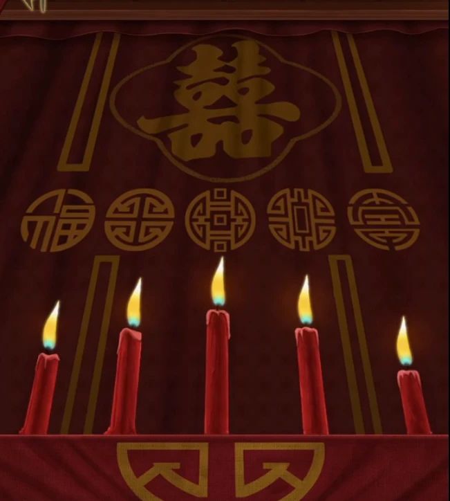 点击右边房屋进门,进门后先点击蜡烛查看一下上面图案对应的蜡烛高度,抽象化的福禄寿喜财的确不好辨认,所以我们可以记中心位置图案,最高的是中心正方形的,中心是十字和长方形的并列第二,福第三,中间是工字的第四,然后调查一下前面的桌子取走左边庚帖,右边盒子调整一下把高度看做是距离中间的位置,打开拿到花椒。