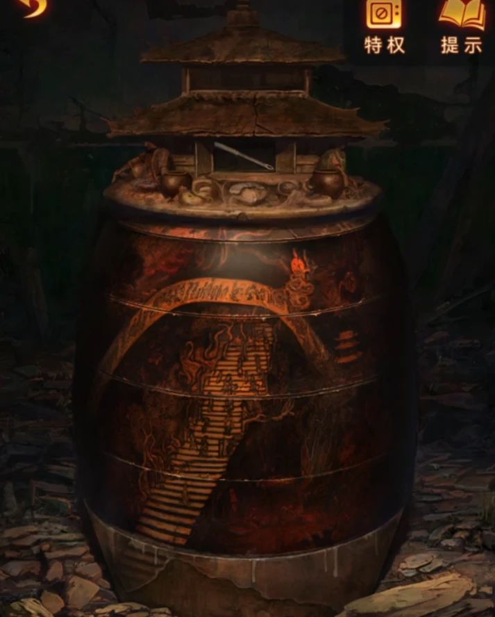 等好戏开场后再次使用望远镜,拿走前面挡风景的酒壶,一会给树浇酒去,先不着急下树,阴童子右边的海报也已经变成了小小戏台对应的皮影戏,所以使用画笔给海报画上嘴巴,这里是个随机移动的准星,当准星在嘴的白色位置时候点击屏幕就能画上一笔,不过只要点出来一点就要从头开始,所以尽量求稳吧~