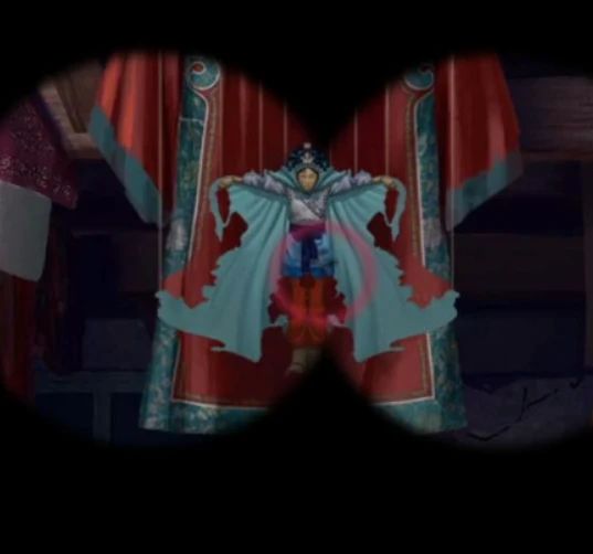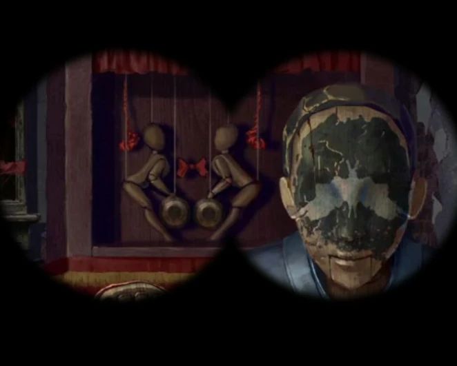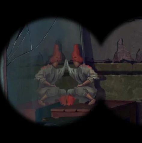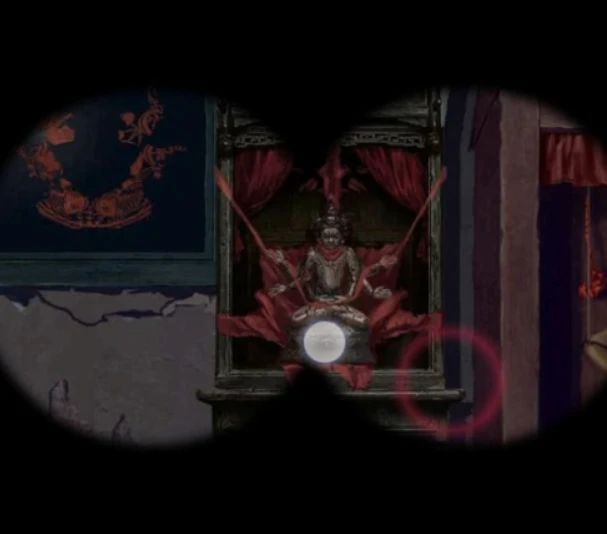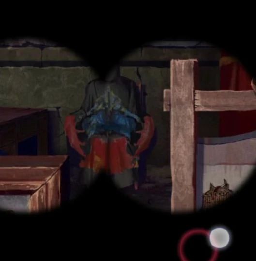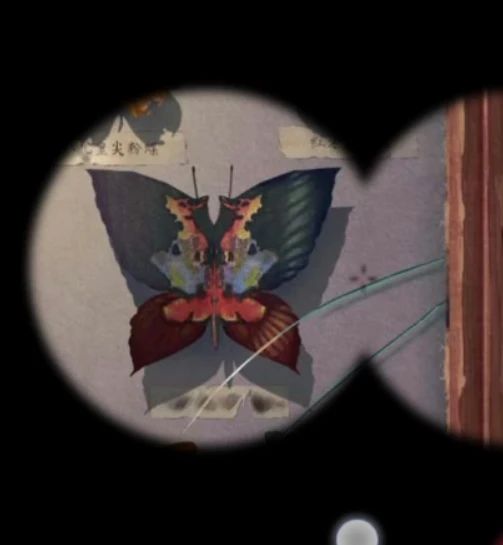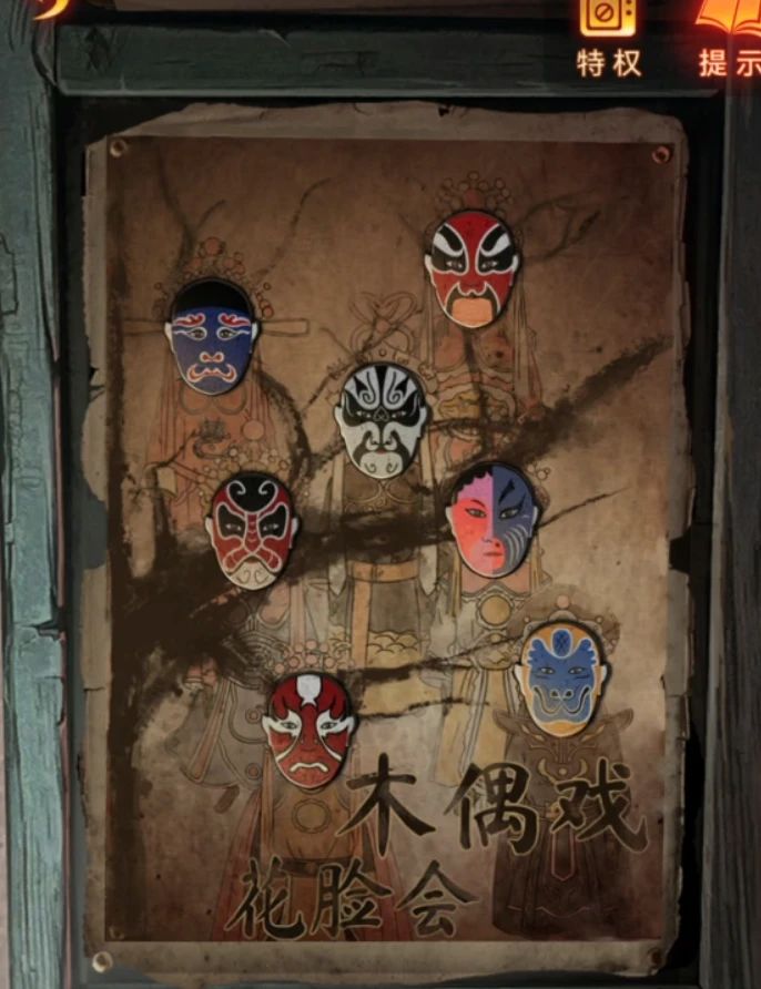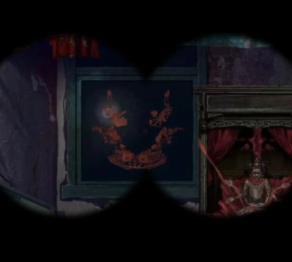 再次来到树上阴童子场景,右边墙上有木偶戏海报,查看一下脸谱和花朵的位置是对应的,调整为相同位置后大火烧掉了挡路的藤蔓,这里可以把面具都拖到旁边后再调整哦~靠近右边的戏台可以用铁钩子把右边的牌位钩过来,回到树下房间里,把牌位放在神龛里下面暗格打开获得望远镜,这里要注意神龛上的字后面会用到,第一个最重要的看不清楚,但是能看到有个尸字头。