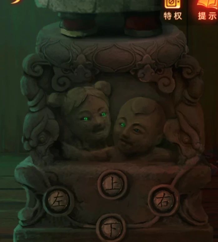 上树后果然看到了阴童子,首先观察一下两人指的方向,这里是随机的,所以一定要理解这个原理哦~观察好后点右下角的向上箭头就能做出选择了,点击正确的方向后阴童子的眼睛会亮起一只,也就是选择正确四次之后就能完成了,完成后获得纸钱,两人动作变成了一个举着东西一个吹东西。
