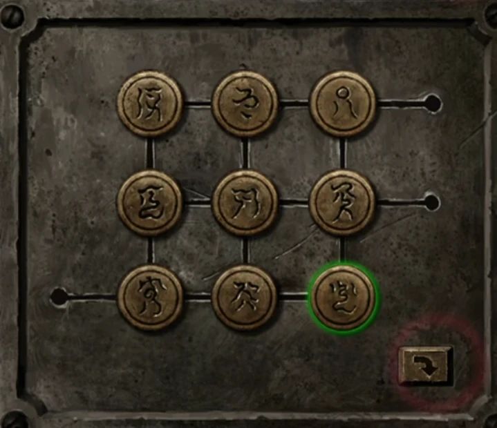 右边的书上重点是画木偶要放在祭坛上先画眼睛再画嘴,皮影眼睛黑色嘴红色,最后一页印着一座桥。看完后调查一下两本书下面的抽屉,抽屉线索就是9个鬼画符,拖动可以调整顺序,右下角的箭头可以旋转,调整到如下后就能打开拿到一个铁钩子。